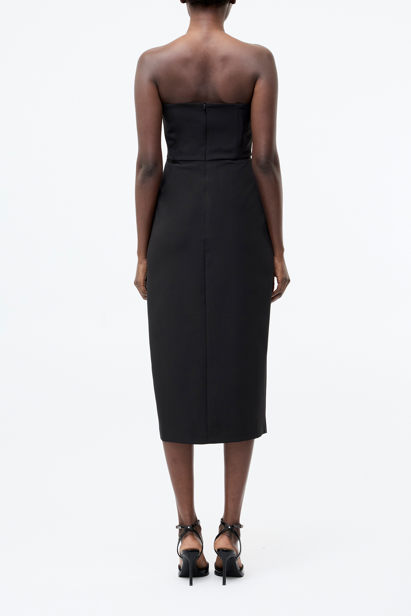 A Strapless And Statement-Making Black Dress. Our Bandeau Organza Mix Frill Midi Dress Presents A Smooth Body With A Feminine Organza Frill Neckline And Playful Side Slit.