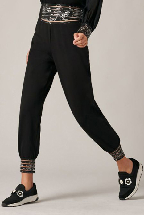 The Betina Are Black Milano Pants Embellished With A Floral Striped Band At The Waist And At Bottom Of The Garment. The Betina Pants Are Tapered At The Ankle And High Waisted With Sheer Detailing. These Fluid And Unique Pants Pair Nicely With The Beatrice Top To Create A Complete Casual Look.