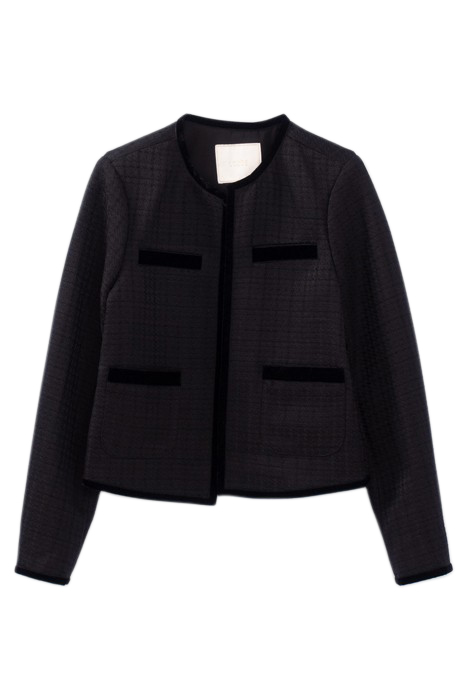 Women’S Black Jacket . Round Neck, Long Sleeves . 2 Faux Chest Pockets, 2 Patch Front Pockets . Waffle Tweed-Look Fabric . Velvet Braid On Neck, Pockets, Cuffs And Hem . Square Fit, Open.