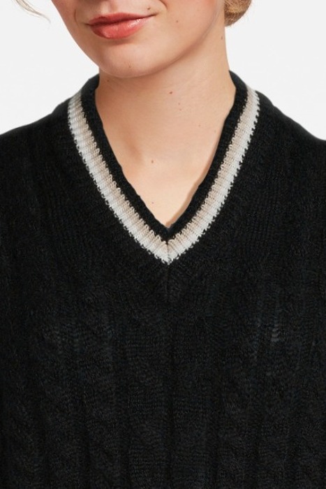 V-Neck Vest Knitted Allover With Braids In Italian Mohair Bl End Yarn. Stripes At Neck Rib In Contrast Yarn In Contrast C Olor.