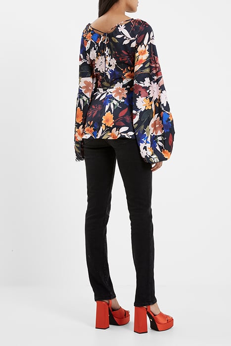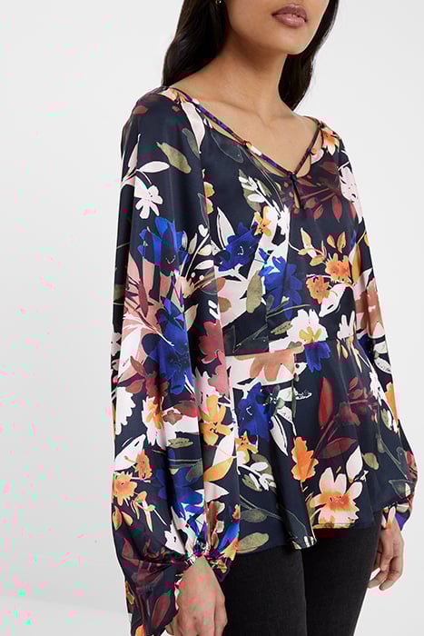 Our Brooke Aleeya Satin Top Is A Vibrant And Vivacious Style Set To Stand-Out. A Retro Silhouette Starring Bishop Sleeves And A Self-Tie Button And Strap Neckline Sets The Scene For Bold And Beautiful Flowers Complete With A Playful Keyhole