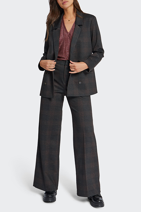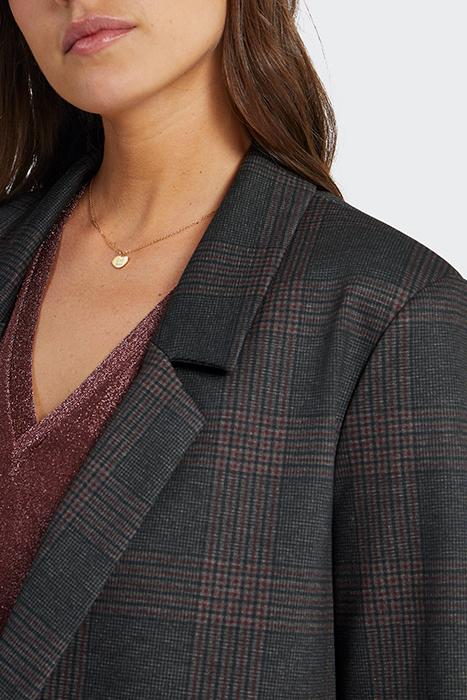Women’S Charcoal Suit Jacket . Suit Collar, Long Sleeves . 2 Piped Side Pockets, Slogan Lining . Prince-Of-Wales Inspired Check Motif . Double-Breasted, Decorative Buttons To Fasten . I.Code Makes A Commitment: Upcycled Fabric, From Leftover Stock.