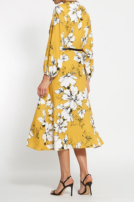 A Very Flattering Wrap Dress With Three-Quarter Sleeve, Tie Detail And Contrast Black Tie Trim And Belt Which Enhances The Simplicity Of Our Tonal Watercolor Print On Rich Gorse Yellow Ground.