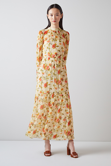A Story Of Print, Texture And Technique, The Swinton Dress Is A Stand-Out Style In Our New Collection. Crafted From A Crinkle Sheer Silk In A Warm, Creamy Hue With A Reimagined Vintage Floral Print In Soft Red, It Uses A Chine Weaving Technique For A Watercolour Effect. It Has A Slip Base, A Pleated Round Neck, Puff Shoulders, Long Sleeves With Fluted Cuffs And A Tiered Midi-Skirt. Wear It With A Simple Sandal For Life'S Dressier Moments.