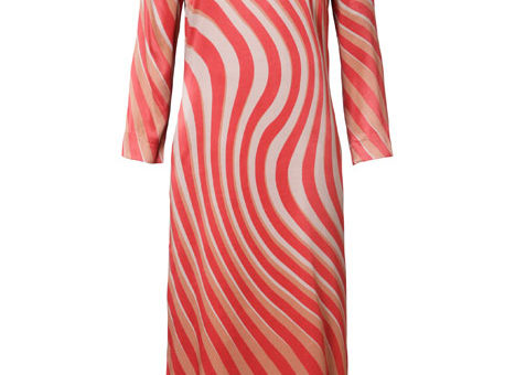 Soepelvallende jurk van Italiaans satijn met grafisch dessin. De jurk met ronde hals volgt subtiel de taille, heeft 7/8 mouwen en een onderjurk. De jurk valt over de knie en heeft een blinde rits aan de achterkant. Ons model is 1,79 m lang en draagt maat 38. 100% CV