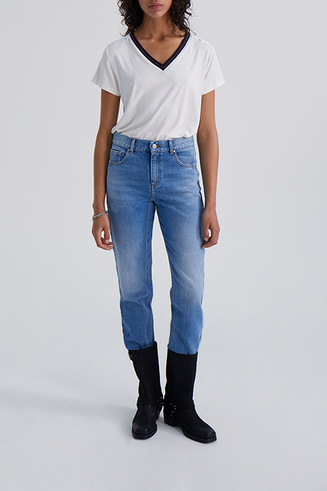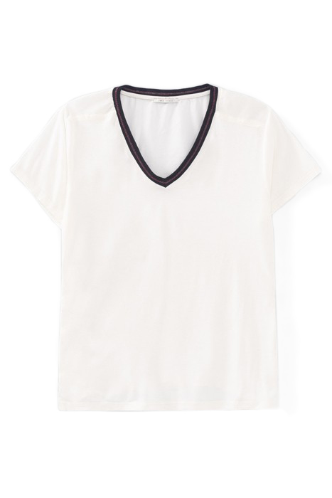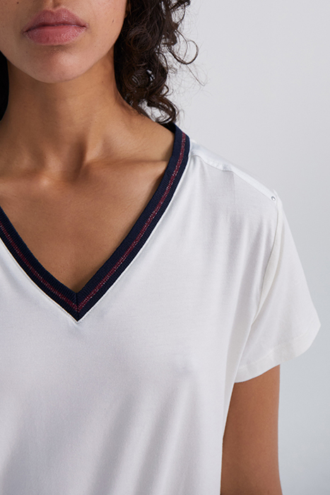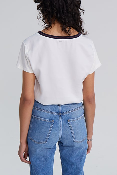 ECRU T-SHIRT WITH NAVY STRIPED RIBBING