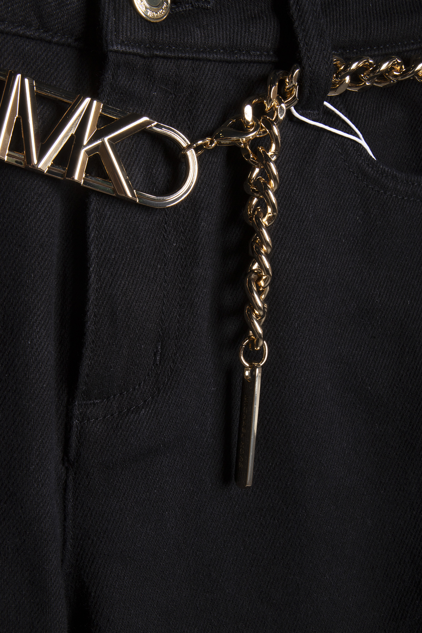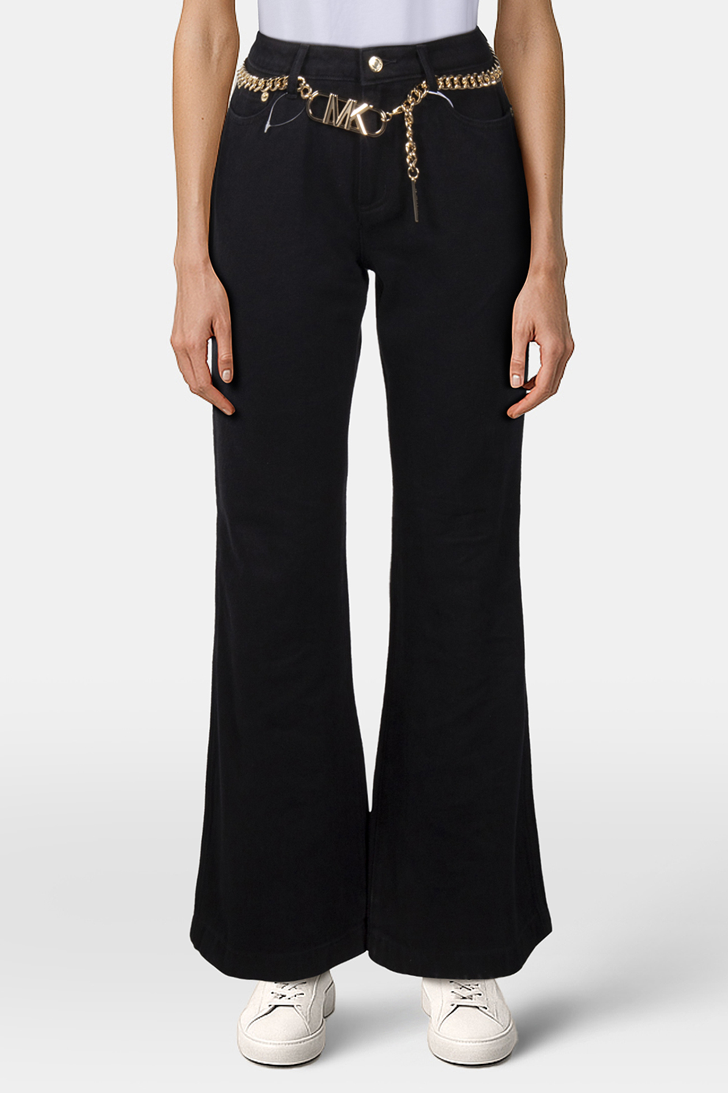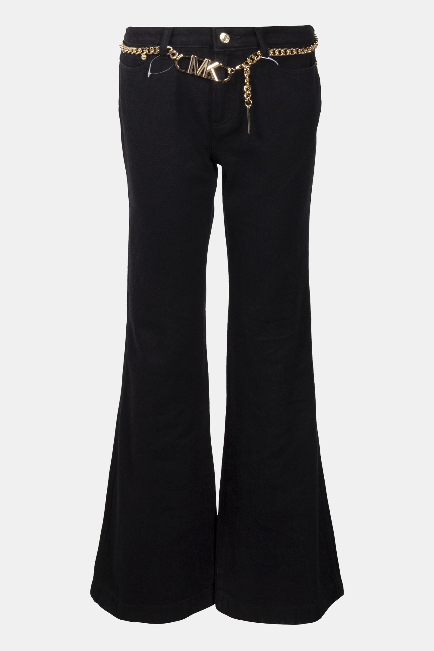 FLARED DENIM JEANS WITH CHAIN BELT IN BLACK