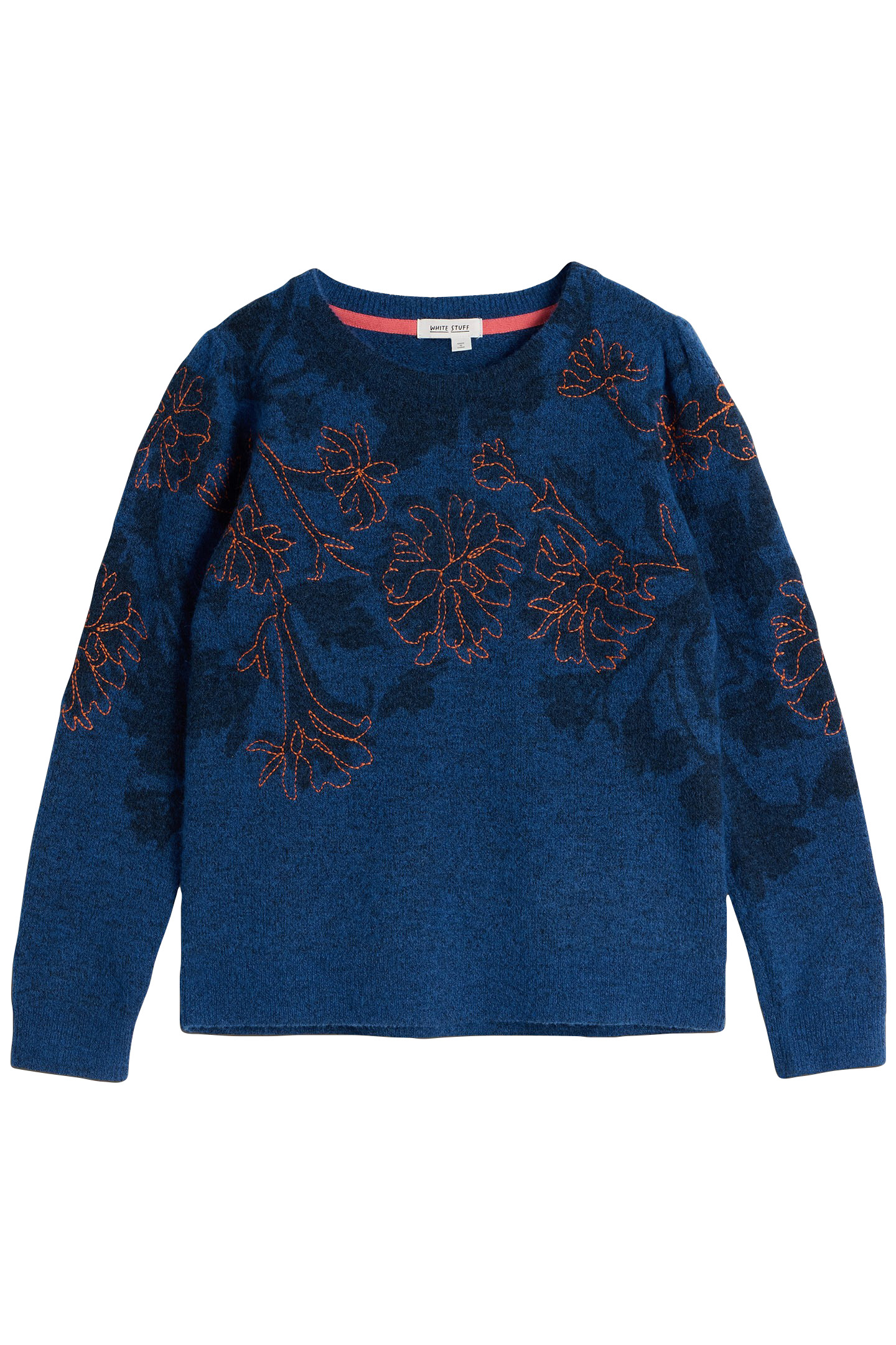 This Nice Blue Jumper Has Shadowy Blooms, Picked Out With A Pop Of Orange Embroidery. We Think It Looks Great With Jeans.