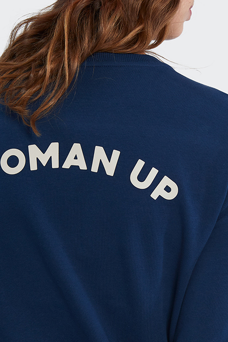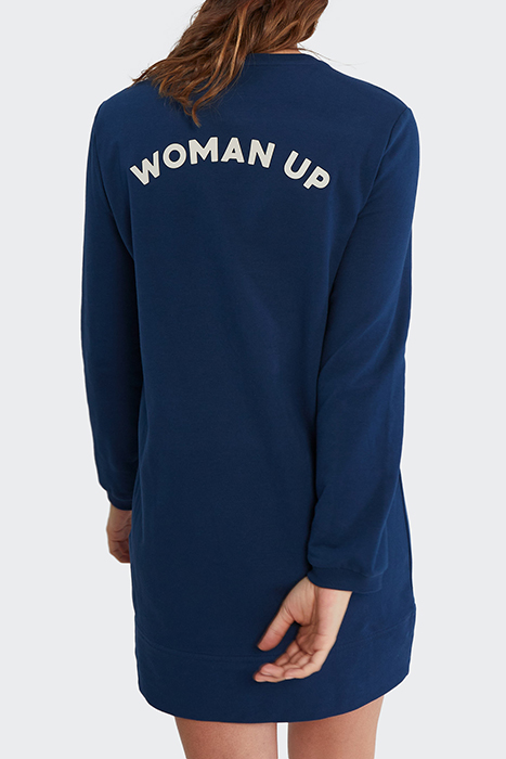 NAVY SWEATSHIRT DRESS WITH SLOGAN ON BACK