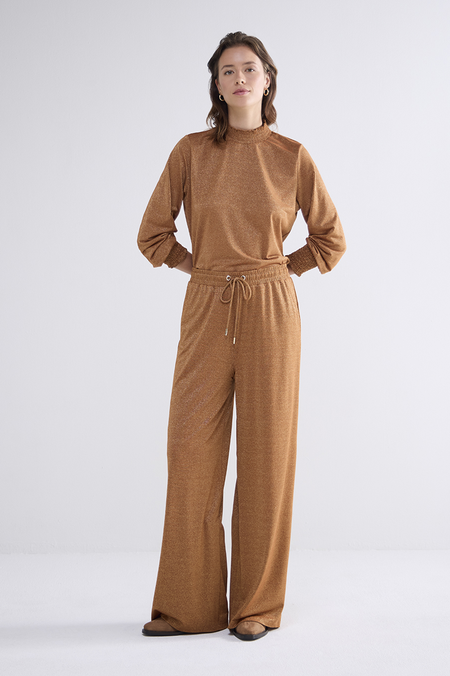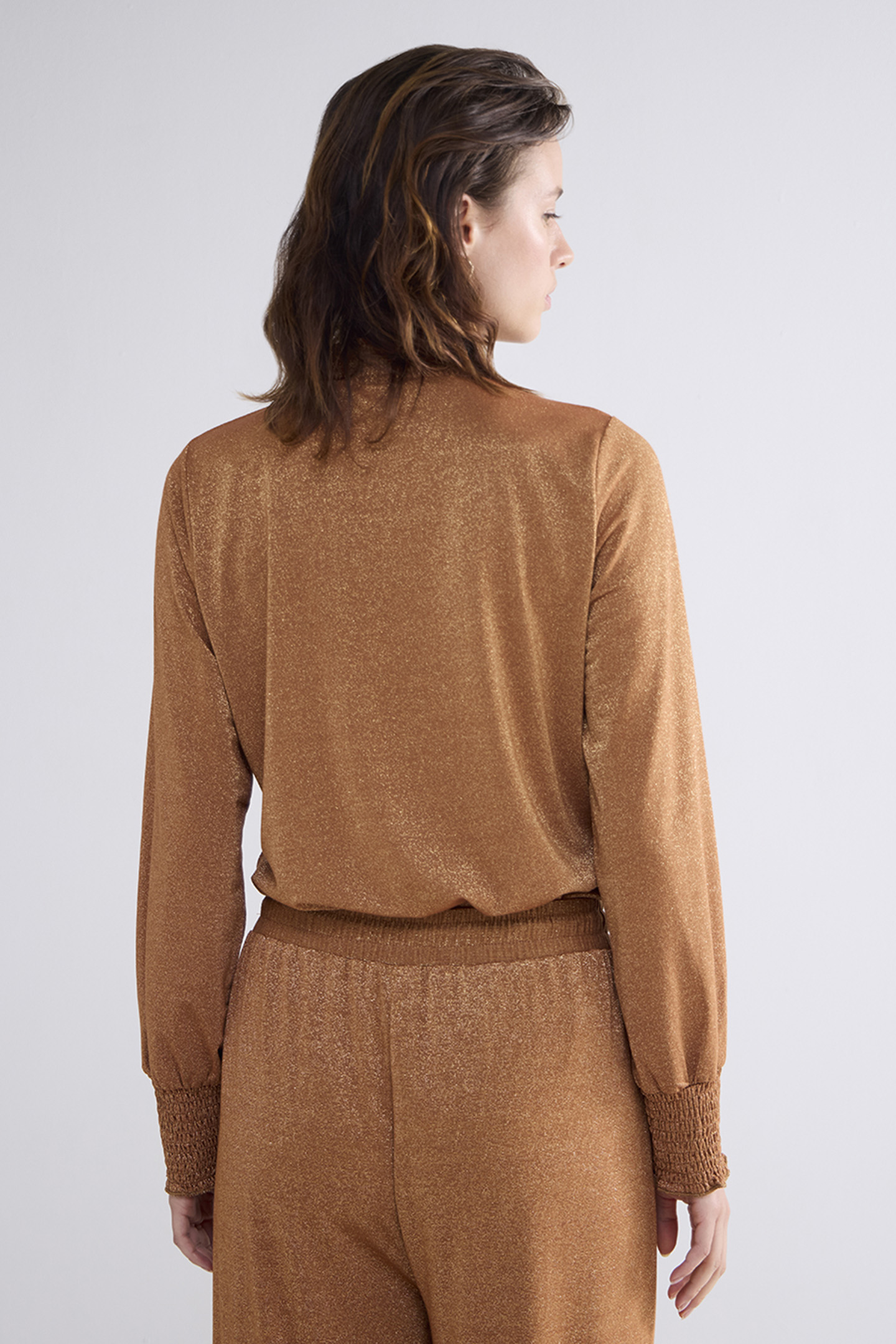 SMOCKED TOP FINE LUREX JERSEY CARAMEL COFFEE